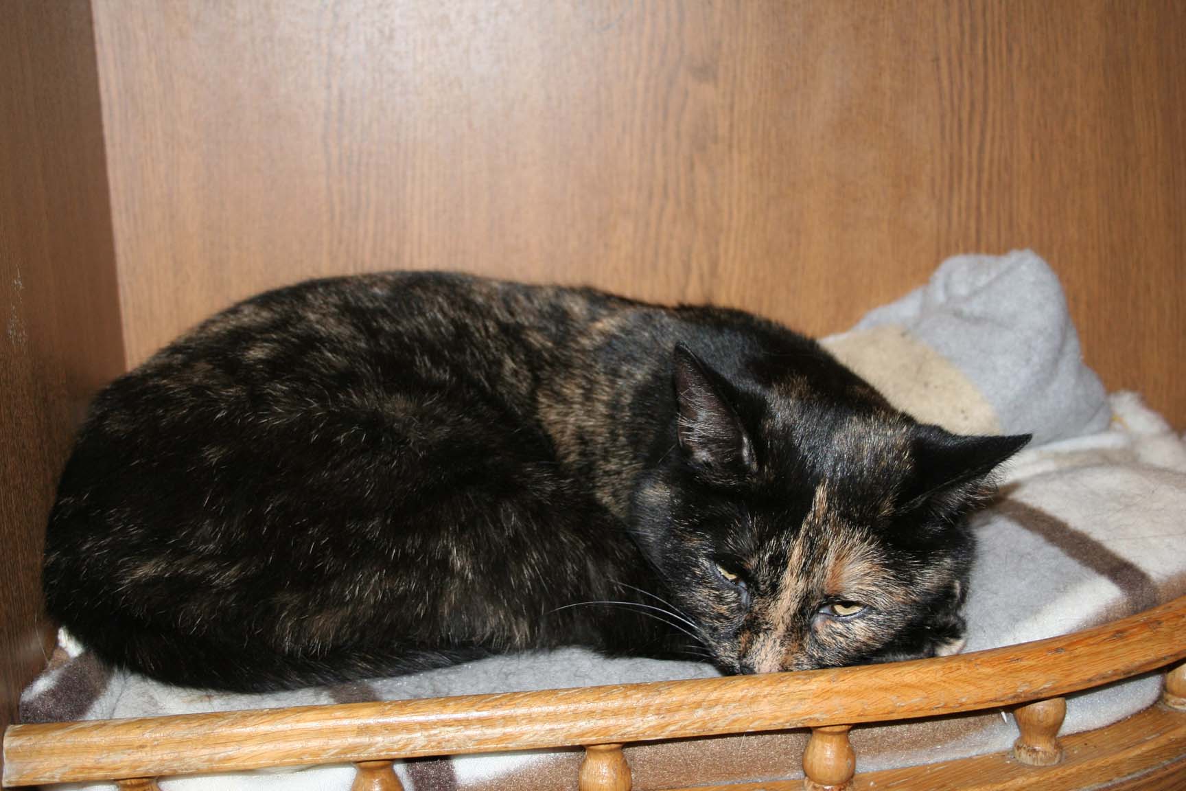 В корзине она со своей приёмной мамой. Масе уже 4 года, но к воспитавшей её кошке Секхмет она очень привязана. Любовь взаимна.