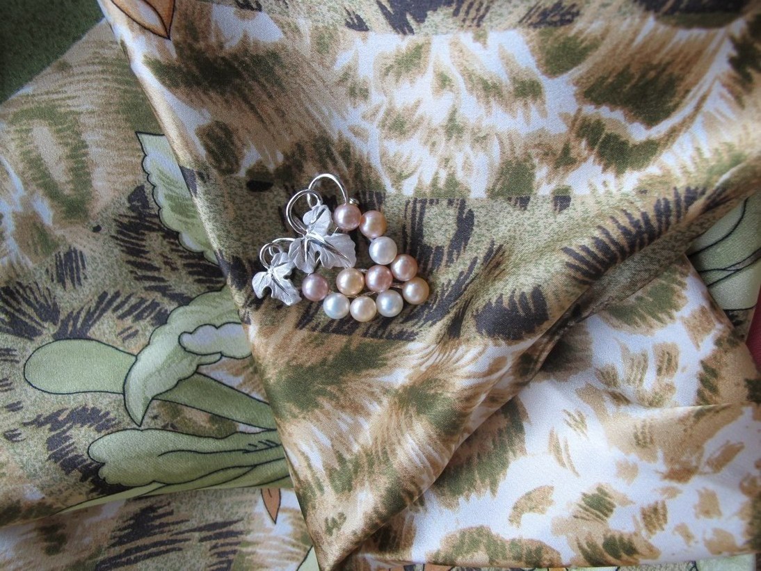 И еще одна серебряная, ничего особенного, но понравилось, что жемчужинки разноцветные. И просто с пальто хорошо, и с шелком, в частности, с Клеопатрой.