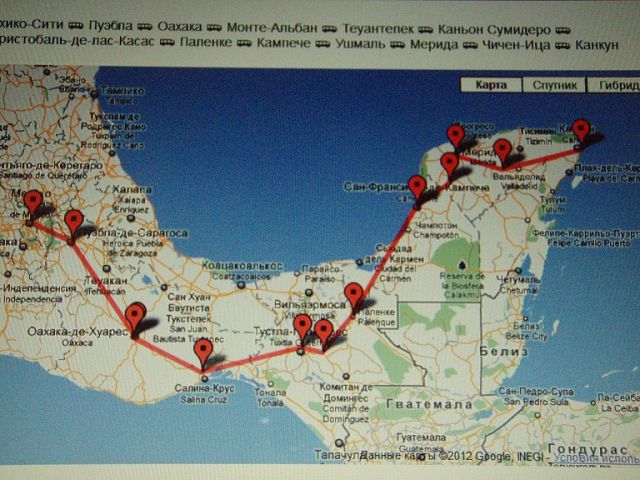 Маршрут путешествия был не короткий....начало в Мехико, и далее по городам, отмеченным на схеме до города Канкуна.