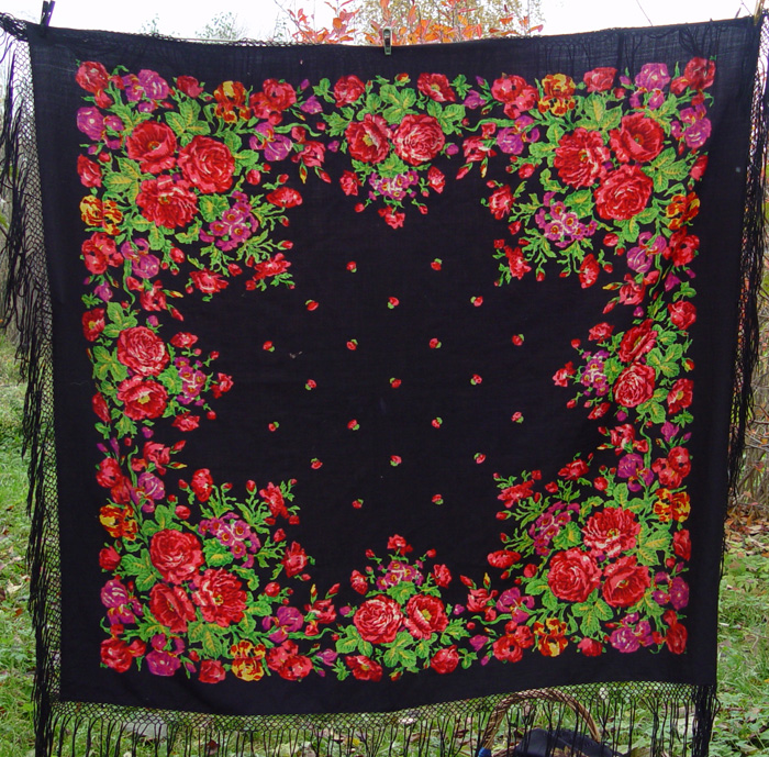 Эта шаль принадлежала маме мужа, точно знаю, что она ее не покупала, скорее всего ей она досталась от ее мамы, возраст шали даже приблизительно не знаю. Размер около 130х130, ткань уплотненная, полотняного переплетения, кисти шелковые с ячейками. Интересно, Павловопосадская она, или нет. Теперь смотрю на нее, и думаю, а не ручная ли это набойка.