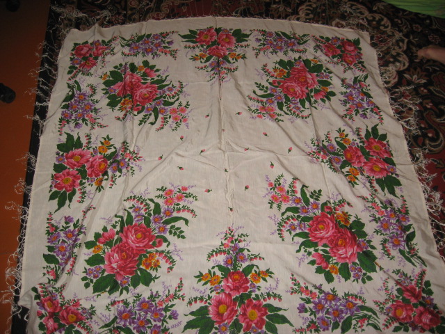 - шали; попадались размеры от 143х143 до 150х150; бахрома на них - хлопчатобумажная, кошмарного вида (IMHO).