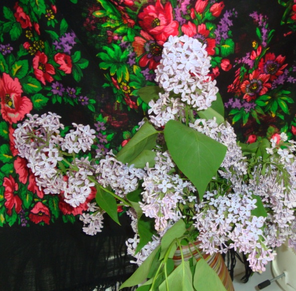 Тема стала совсем непопулярной. А жаль. Добавлю фото платка Лето. На нем такая милая, немного лубочная сирень.