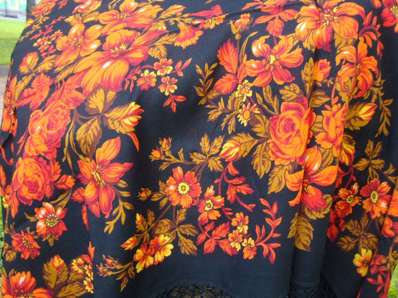 Мне кажется, что именно с этого платка был стырен рисунок для многочисленных "японцев", которые гуляли по стране. Вот эти второй и третий ряд узора каймы - явно первоисточникдля них. Очень необычно выписаны розы и тюльпаны. Такое повторить, конечно, нельзя. Какая красота!