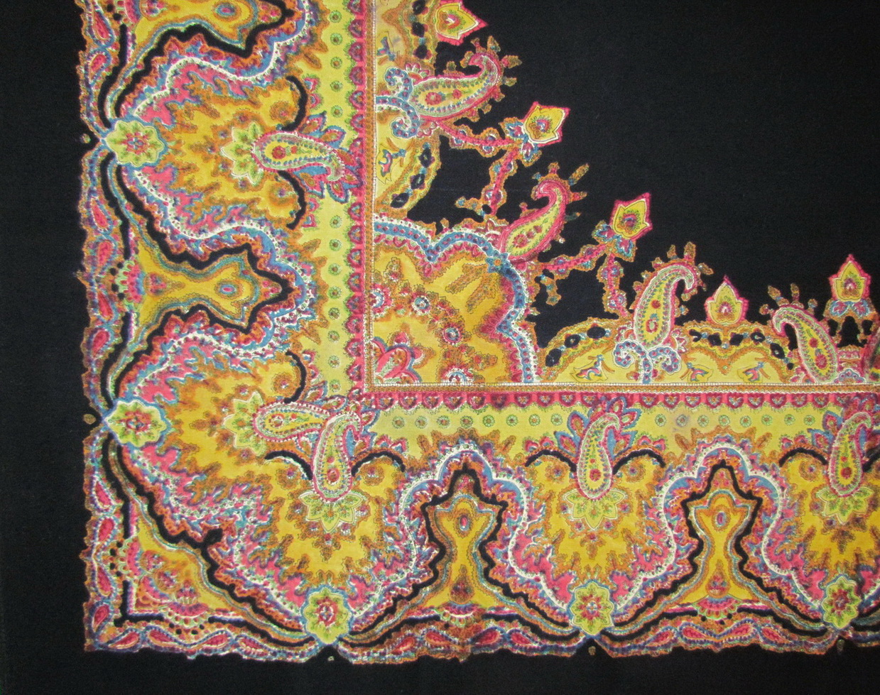 Шаль очень солнечная, смотрится по-восточному. На манекене - вообще глаз не отвесть. Фотки будут еще лучше. Стоит отметить глубокий бархатный черный фон. Плотную и мягкую текстуру - так и липнет к плечам и рукам. Смотрится очень даже актуально в носке. Это все благодаря бережному хранению прежней уже старенькой хозяйки, которая, по словам внучки, тряслась над этой своей реликвией и почти не доставала из заветного сундука. Ну и конечно же такая красавица-шаль достойна новой плетеной бахромы, чем и займусь в ближайшее время.