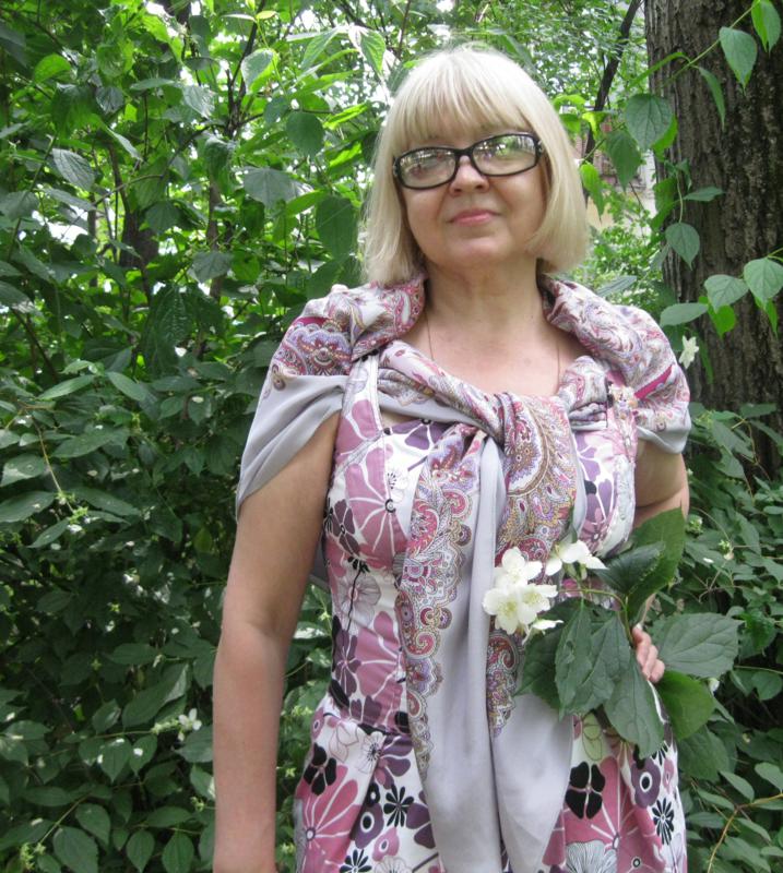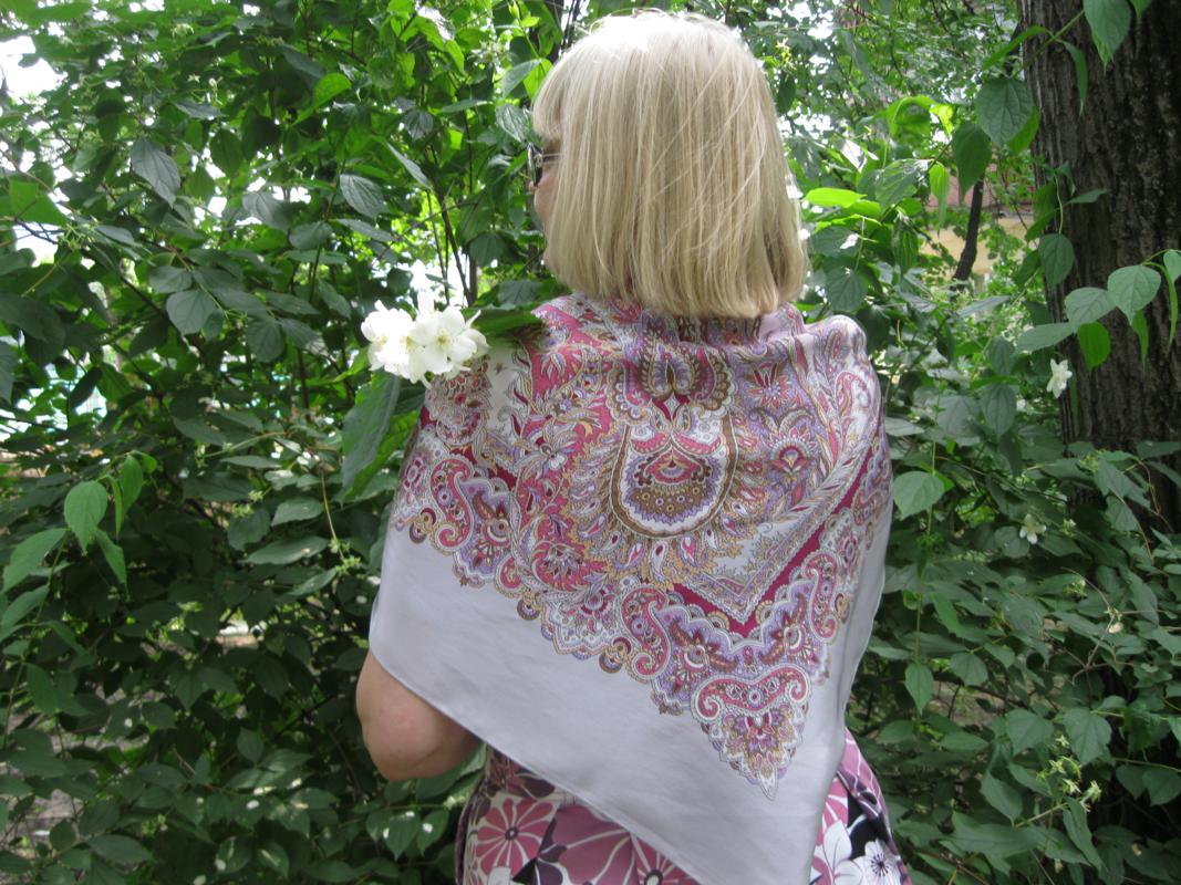 Появилась в моей коллекции шёлковая шаль ВОСТОЧНЫЕ СЛАДОСТИ 1429-1 (в виде оверлочного лоскута), такого нежного сиренево-розовато-дымчатого колорита. И как-то так нашлось для неё с платье-сарафан из плотного хлопка, в рисунке которого есть аналогичные цвета, но... сам рисунок графичный, контрастный, насыщенный, не содержит полутонов. Соединила их в ансамбль. Да что-то я сегодня всё говорю-говорю...