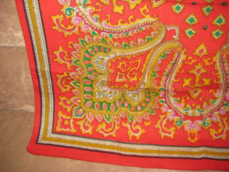 Нашла еще фотографии этого платка, но хозяйка тоже не знает его происхождения, у нее он с 80-х годов. Я не исключаю, что это сделано в Павловском Посаде, но смущают два момента. Во-первых, обработка края: обшивать маленькие шерстяные платки оверлоком в ПП стали лишь относительно недавно (в конце 1990-х годов еще не оверлочили). Во-вторых, нехарактерный набор красок (для Павловского Посада в тот период). Но, конечно, могу и ошибаться.