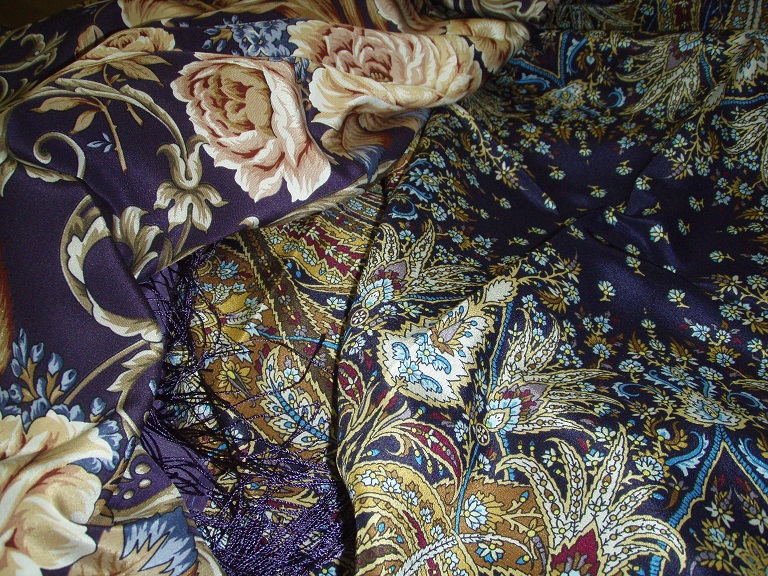 И, сравнение....Для сравнения подбирали родственную ткань и подходящий колорит. Оказалось, что наиболее сходен по колориту с "Королевским балом"-2 крепдешиновый шарф "Маков цвет"-3. Тон на "Маковом цвете"-3 (если очень сильно присматриваться) уходит чуть в "коричневатость", на "Королевском бале"-2 - более бордо-вишнёвый...(первые две фотографии - при искусственном освещении).