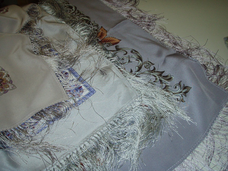 ...а также выполнить просьбу - сравнить "условно-серые оттенки"....Шали совершенно по-разному ведут себя в помещении с электрическим светом, причём, важно ещё, насколько этот свет интенсивен. Здесь - при электрическом и тусклом дневном свете. Кайма "Королевского Бала" выглядит как серо-сиреневая (ближе к серому), "Песни ветра" - как серо-голубоватая, "Восточных сладостей" - серо-бежевая.