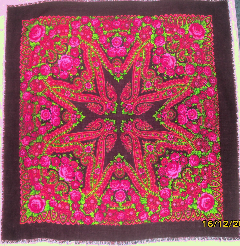 Мне кажется, что у моей мамы есть такая шаль(125Х125), только в другом колорите- ярко красная с сиреневой сиренью. Куплена была примерно в 89-91 годах. Попрошу сфотографировать чтобы сравнить.olgaballet22 писал(а):Изделие 80-х годов. Название не знаю