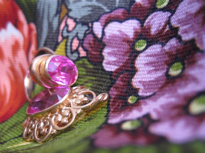 Цитрус, вероятно, представленные Вами изделия с "малиновыми камешками" ещё советского периода. Посмотрите в таком случае на пробы: если их три, то третья часто говорит о натуральности камня - в таком случае это, скорее всего, розовый турмалин (рубеллит). Если по две, то это, не исключая возможность натуральности камня, может говорить и об искусственном рубине (корунде), как вставке. Хотя всё же больше похоже на рубеллит - ювелир скажет точнее.