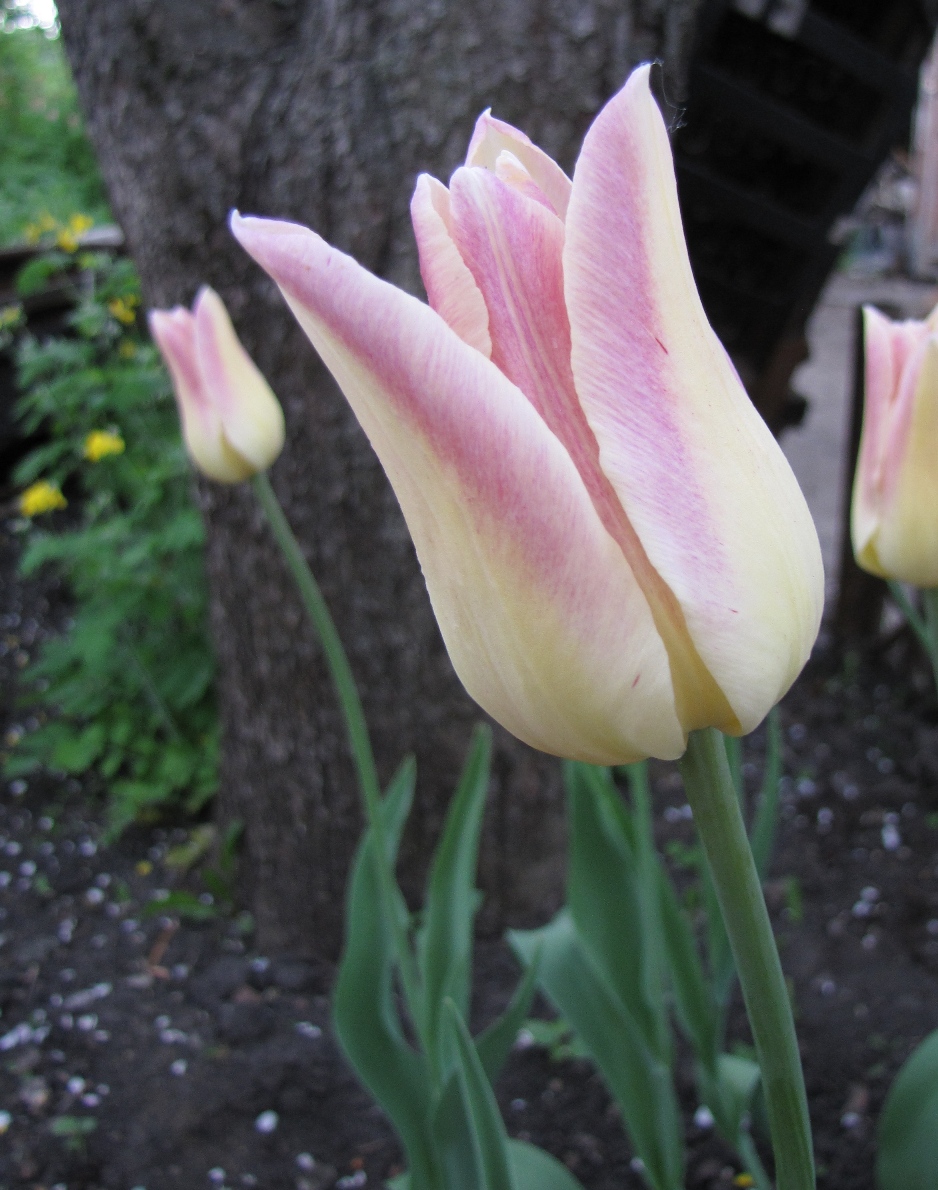 А теперь немного весны... Первый раз посадила на участке тюльпаны. Раньше сажала только неприхотливые однолетники: места мало, тень, земля глинистая. Сколько было радости, когда среди зелени я увидела первый бутон!