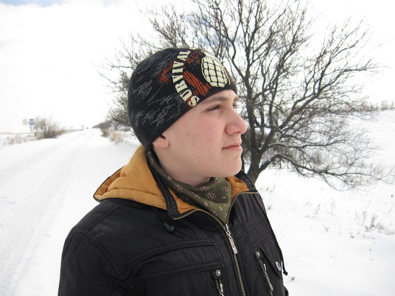 Добавлю фото своего старшего сына. У него уже два кашне - Дон-Кихот коричневый (шерсть) и Эдельвейс зеленый (шелк/шерсть).