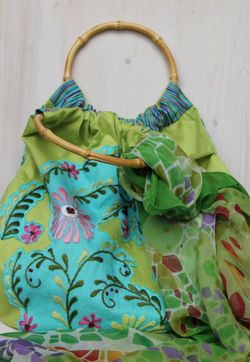 Немного похулиганила... Вспомнила, что у меня есть сумка с вышивкой в мексиканском стиле (по мотивам вышитого платья Фриды Кало). Решила совместить её с шифоновыми платочками "Парк Гуэль". Что-то общее - испанское прослеживается... Но мне кажется, что с бирюзовым платочком было бы интереснее.
