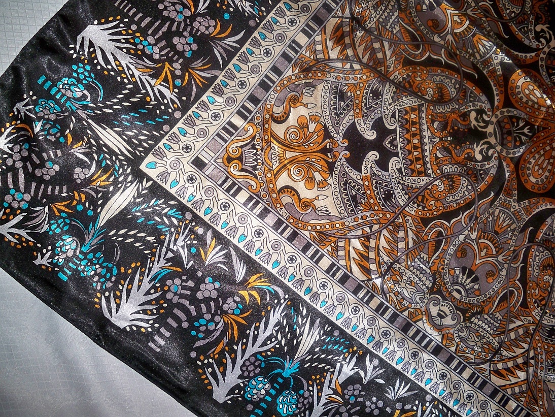 На одном из вещевых рынков нашего города нашла, а потом и купила три атласных платочка из полиэстера, размер 89х89. Рисунок 846-Новелла, в чёрно-серо-белом исполнении. Золото Исиды-два колорита. На вопрос: откуда платочки?, продавец ответила, что из Москвы. Цена одного платка 200 рублей. Этикеток не было, только пришит ярлык с названием материала и знаками по уходу за изделием.