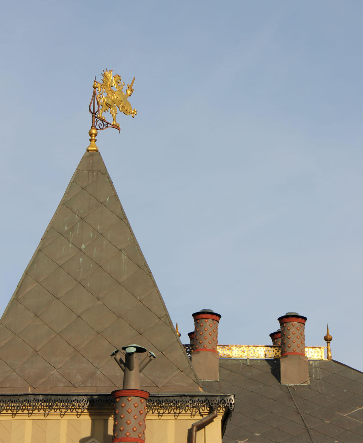 Вчера, гуляя по Варварке, я заметила на крыше одного теремка вот такой флюгер в виде крылатого льва и дымовую трубу, аки змей-Горыныч о трёх головах. Красиво, правда же!?