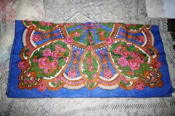 Вот тоже платок остался после бабушки... Он шерстяной и с шерстяной бахромой. Пыталась померить его обычной линейкой, очевидно, после стирок давал усадку и, приблизительный размер его сейчас, 85 х 85 см.