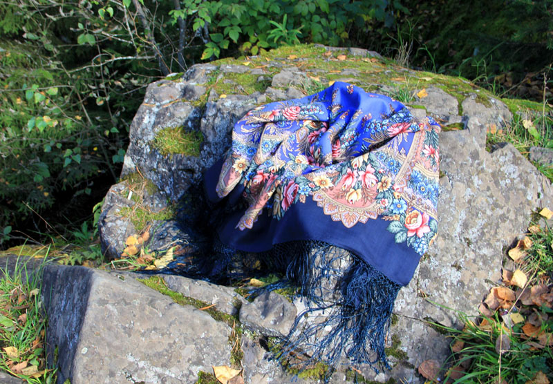 Синяя шаль "Июньское Утро" побывала у водопада Кивач. Полежала на камне... напиталась карельской энергии.