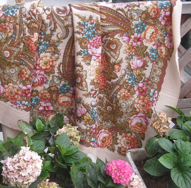 Красные кленовые листья словно упали на синюю шаль, так пионы совпали с ними оттенком. А на первом фото букет в вазе кажется продолжением платка, цветочек шиповника их объединяет.