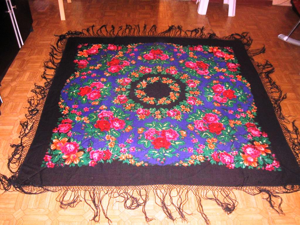 4. 98х98, шерстяной с шерстяными кистями, ткань плотнее чем у платков 95х95. Ну, со слов ему тоже лет 15. Был на форуме, и в этом колорите тоже был. Номер вроде бы не определен. Могу только заметить, что цвет поля на фотографиях у всех опять заметно поехал: платок не пошло-алый, а чууточку вишневее и темнее, очень приятный оттенок: