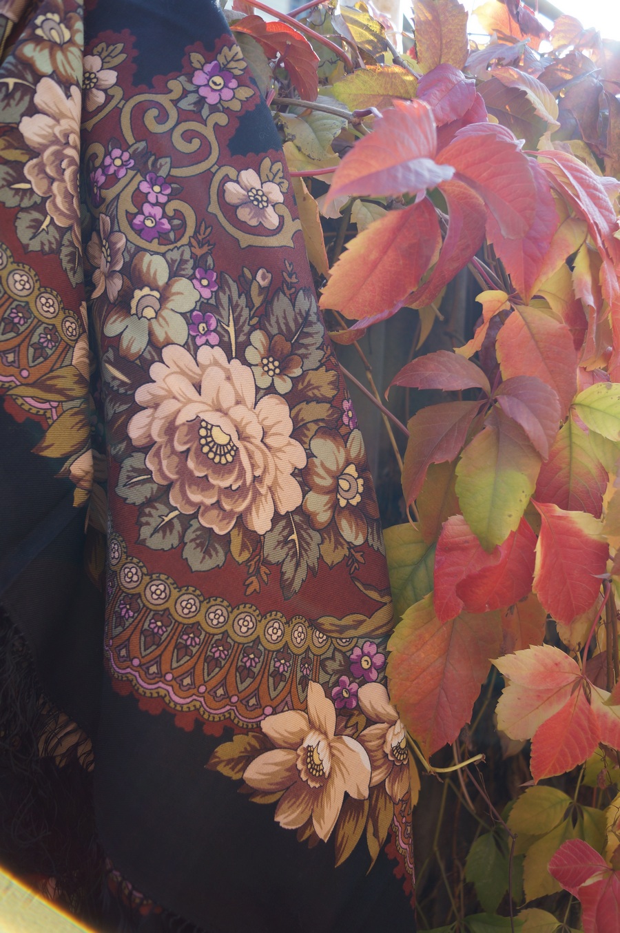 Вот кто б мог подумать, что Русские сезоны этого колорита так фотогеничны и так эффектно выглядят на фоне тёмного бархата. Заметка на память для тех, кто ее имеет. С черным или шоколадным бархатным платьем эта шаль произведёт неизгладимое впечатление на любого.