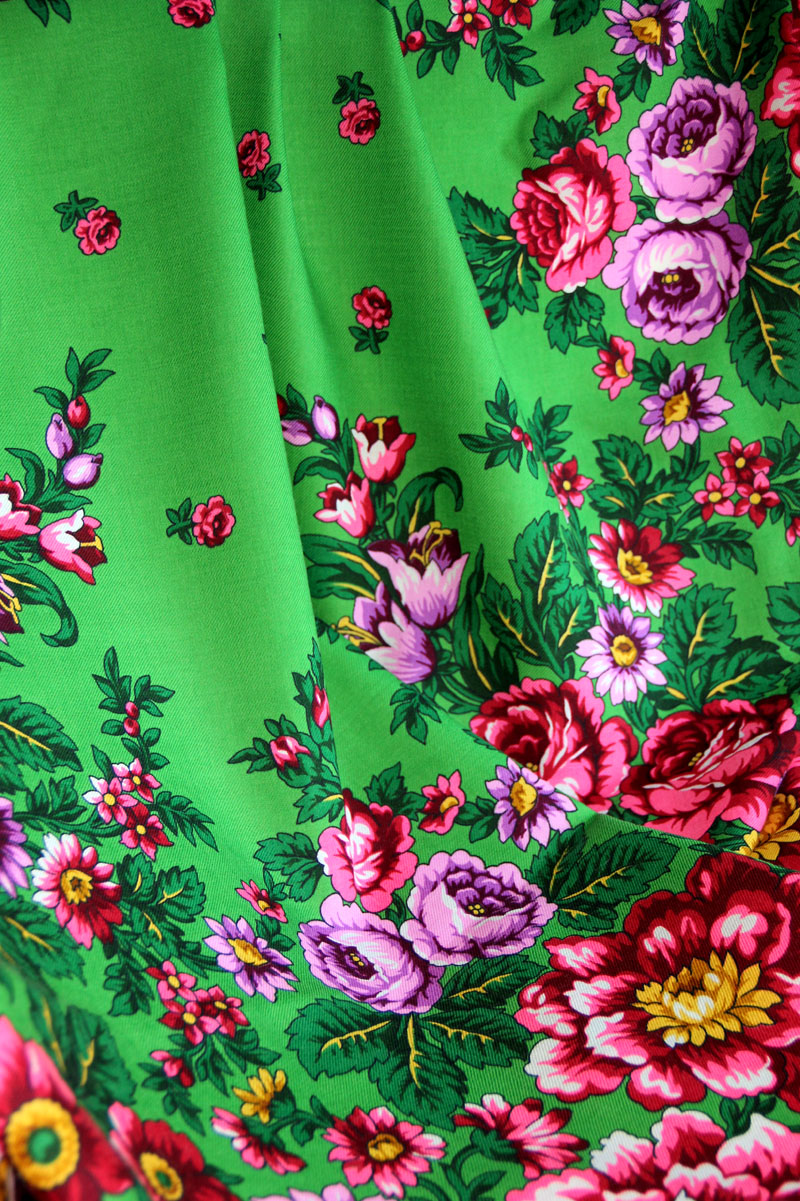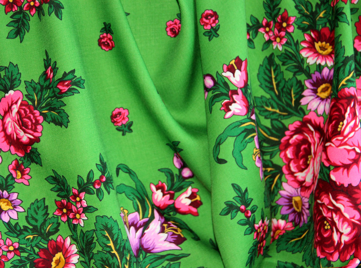 И очень радостная, весёлая шаль зелёного цвета с сиреневыми и розовыми цветами. К тому же я испытываю любовь к старинным рисункам с мелкими цветочками в среднике, что и проявилось в шали "Переполох" (30).