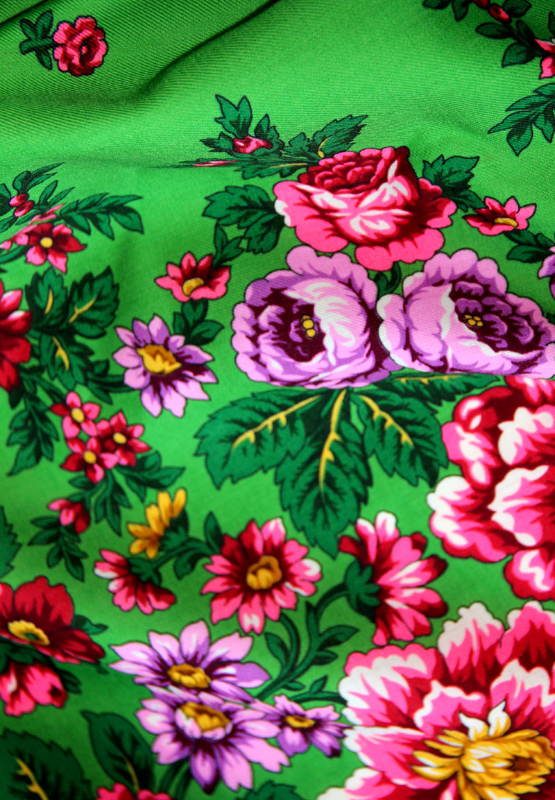 И очень радостная, весёлая шаль зелёного цвета с сиреневыми и розовыми цветами. К тому же я испытываю любовь к старинным рисункам с мелкими цветочками в среднике, что и проявилось в шали "Переполох" (30).