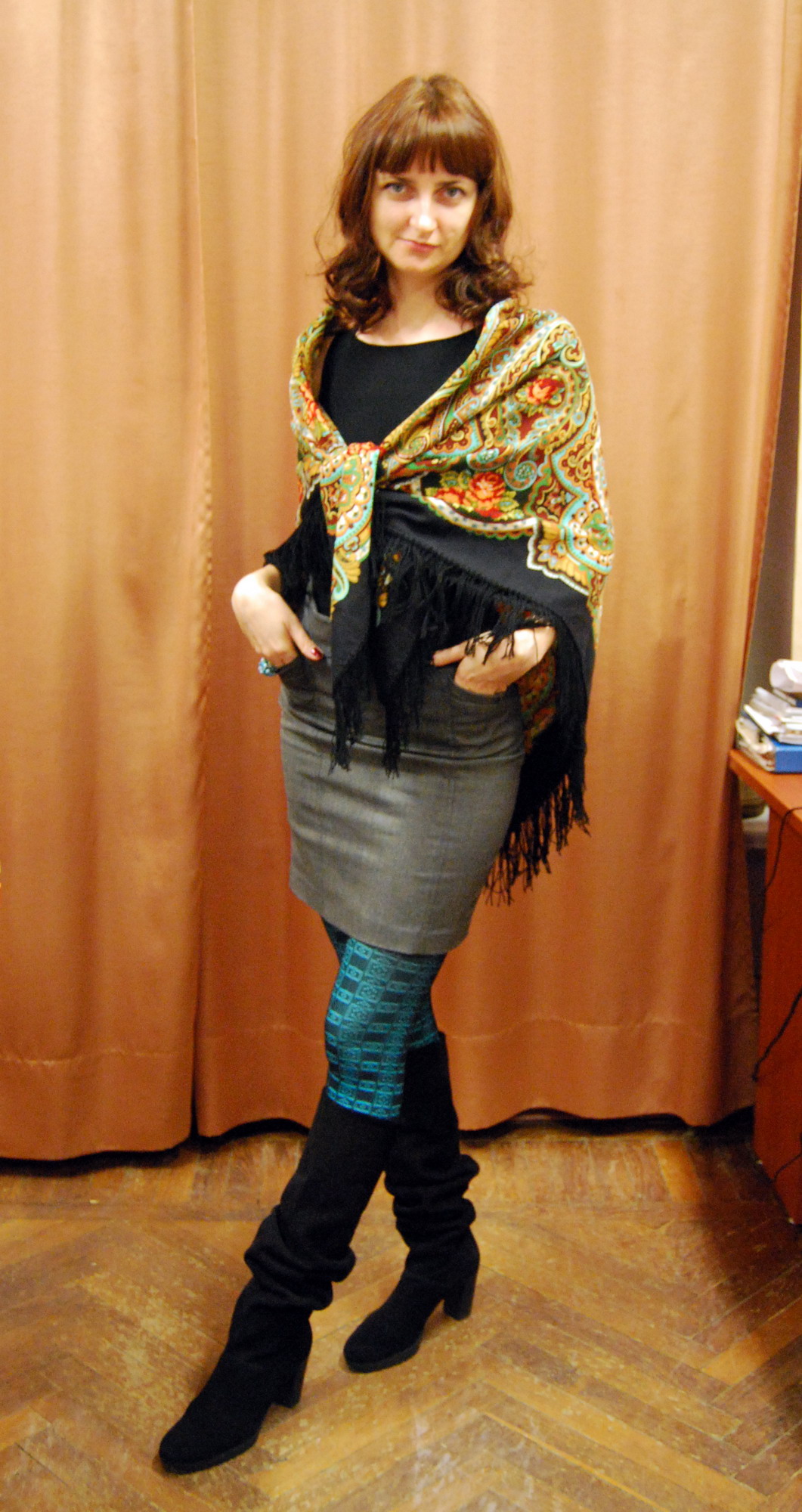 , мне очень понравились Ваши эксперименты с цветом!!! Бирюзовые колготки определенно придали пикантность образу. Ваши возраст и прекрасная фигура вполне позволяют Вам яркие и экстравагатные наряды. Экспериментируйте смелее и показывайтесь в Примерочной.