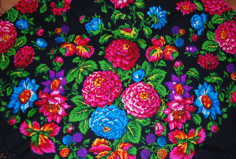 Наталёна на шерсти хуже бы смотрелся. На атласе эффект лака получается, как Eva первая это подметила, потому рисунок эффектно выглядит. Цвет красивый самого платка, рисунок некрупный и фактура шелка-всё подобрали отлично. Платочек этот несомненная удача мануфактуры, на мой взгляд. И для "местных", и для "иногородних".