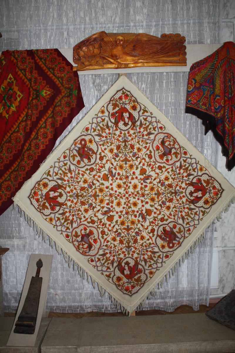 В музее есть 4 шали, они в витрине, их даже страшно трогать, так хрупка ткань, мы на них любовались. Нам рассказали, что один был для старообрядок, 2 других для молодых девушек, 1 для вдов, когда они снимают траур (черный фон с красными крупными цветами, оч. Красиво, мы сейчас такие любим).