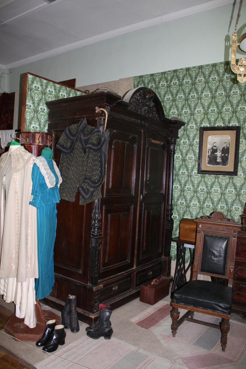 Справа от лавки за перегородкой интерьер комнаты молодой барышни, в которую можно было бы попасть через дверь за спиной "приказчика", поднявшись вверх по лесенке.