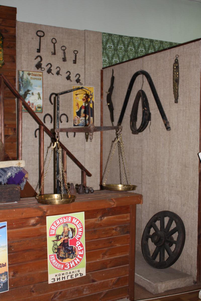 Справа от лавки за перегородкой интерьер комнаты молодой барышни, в которую можно было бы попасть через дверь за спиной "приказчика", поднявшись вверх по лесенке.