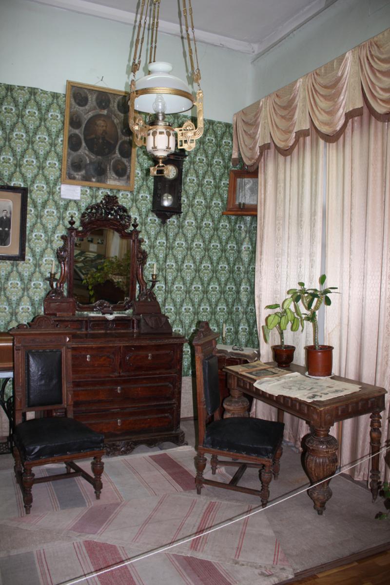 Справа от лавки за перегородкой интерьер комнаты молодой барышни, в которую можно было бы попасть через дверь за спиной "приказчика", поднявшись вверх по лесенке.