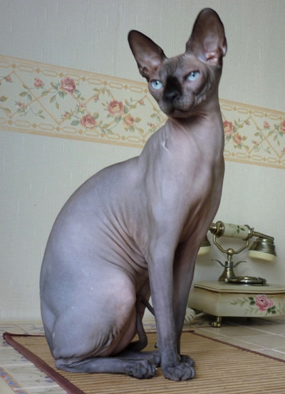 Мышонок(Мышка), первая наша киса, появилась у нас случайно, позвонила тётя моя(она ветеринар), и говорит: "Принесли котёнка-сфинкса усыплять, ей месяц, болеет, скорее всего ринотрахеит, очень истощена, но поднять на лапы можно, возьмешься? Т.к. хозяйка категорично настроена, сказала - не усыпите-выкину её!", ну я конечно согласилась, мне ее привезли, ой страшно было это "несчастье" брать в руки, на ладошке помещалась, одни косточки, и глаза с носом такие больные-больные. Ладно, выходили, красотка стервозная выросла