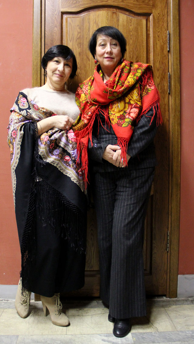 Красная шаль у Нади такого красного цвета, что сейчас днём с огнём такого не найдёшь. Украшения тоже под цвет шали, а серый костюм своей строгостью оттеняет её живописную буйность (это оригинал восстановленного платка "Цветочная сказка").