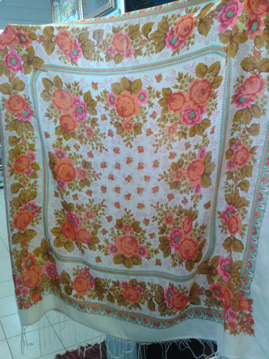 Алла, в жизни цвет платка не совсем такой, как Вы видите. Хозяйка платок носит, поэтому ткань от времени немного истончилась и слегка, как-бы помягче сказать, потеряла белизну. Но яркие оранжевые розы с бирюзовыми серединками светятся изнутри - очень красиво и жизнерадостно. Хозяйка говорила, что как-то испанцы просили продать им платок. Но он не новый, увы, не продаётся. Кстати, в салоне продавались современные ПП платочки, в том числе и моя ФЕЯ СИРЕНИ, и Настино РУССКОЕ ЗОЛОТО.