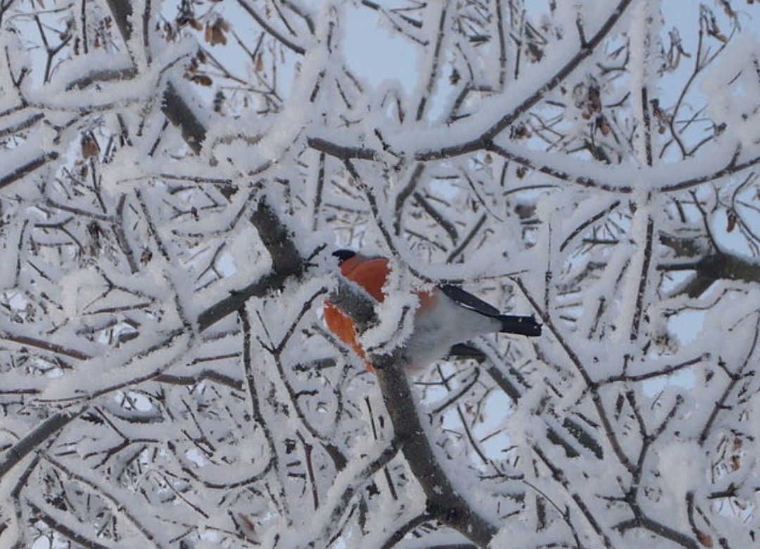 Снегири - красивые птицы и мороз им очень идёт к оперению.