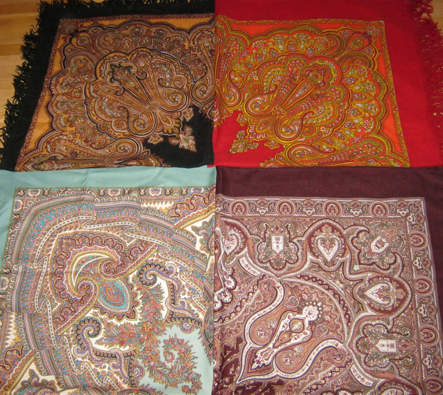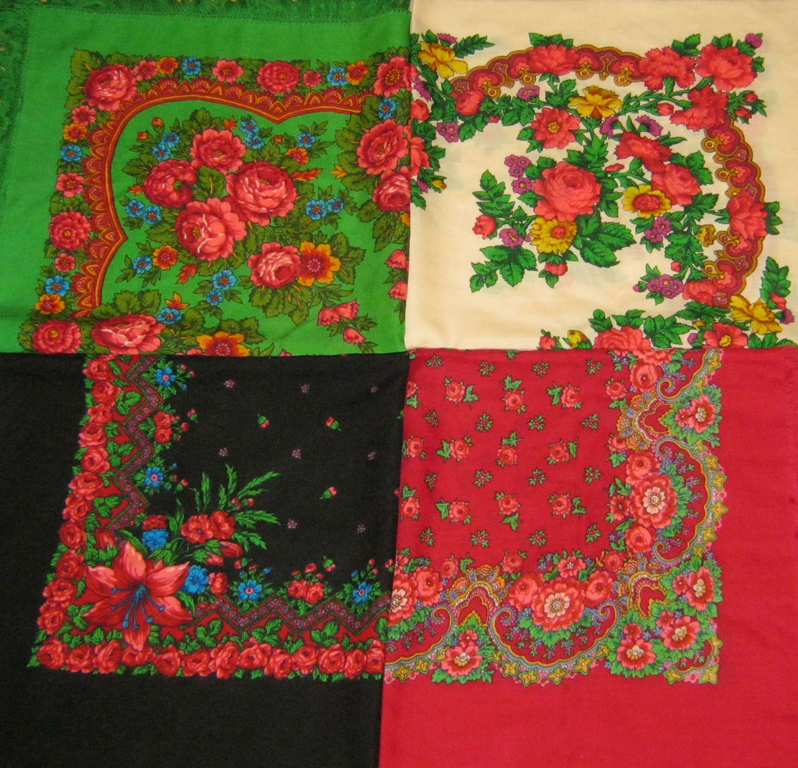А это - платки, четвертушки которых не идентичны, в отличие от остальных. Пока тоже восточноузорчатые: