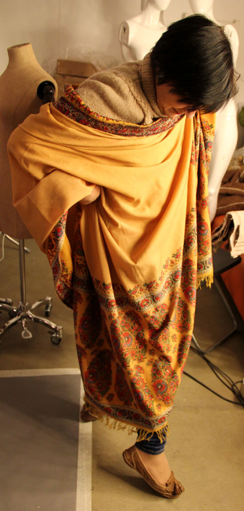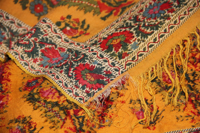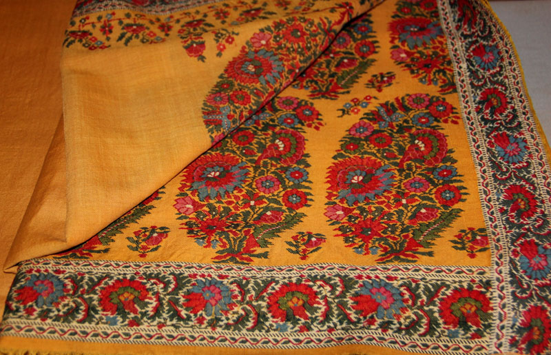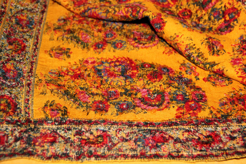 И ещё жёлтая кашмирская шаль - теперь это не квадрат, а прямоугольник. На ощупь шерсть очень колючая и плотная. Да ещё ткачество придаёт плотности в местах с орнаментом.
