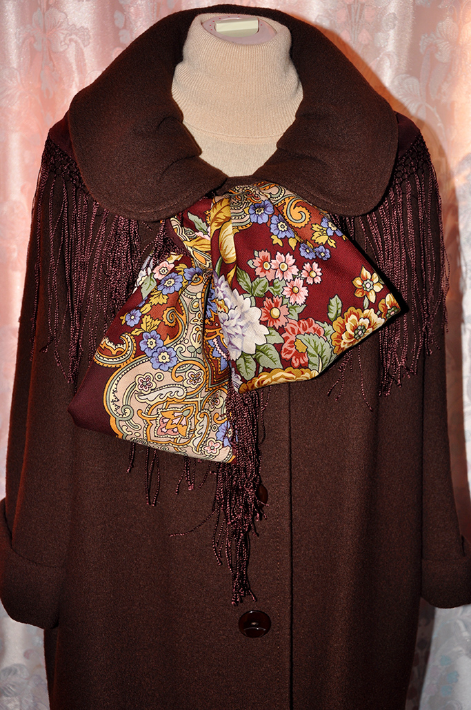 Задача бала непростая. Думала я, думала, как сделать так, чтобы "и волки были сыты, и овцы целы", то есть, чтобы платок не скрыл фасон пальто и не "перебил" ретро-тематику наряда, а, с другой стороны, чтобы и платочек не потерялся в "скрутке", и решила завязать шаль в виде бантика, ведь бант - деталька, очень характерная именно для 60-х.