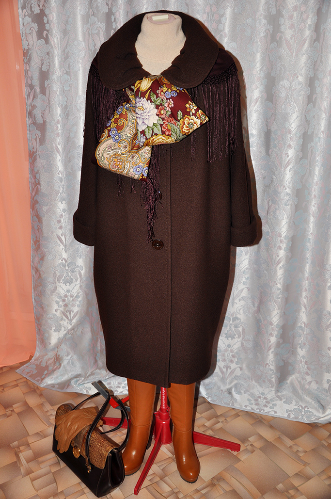 Но сначала сообщу исходные данные: пальто из шерстяного лодена глубокого шоколадного цвета, шаль "Радоница-7" и аксессуары.