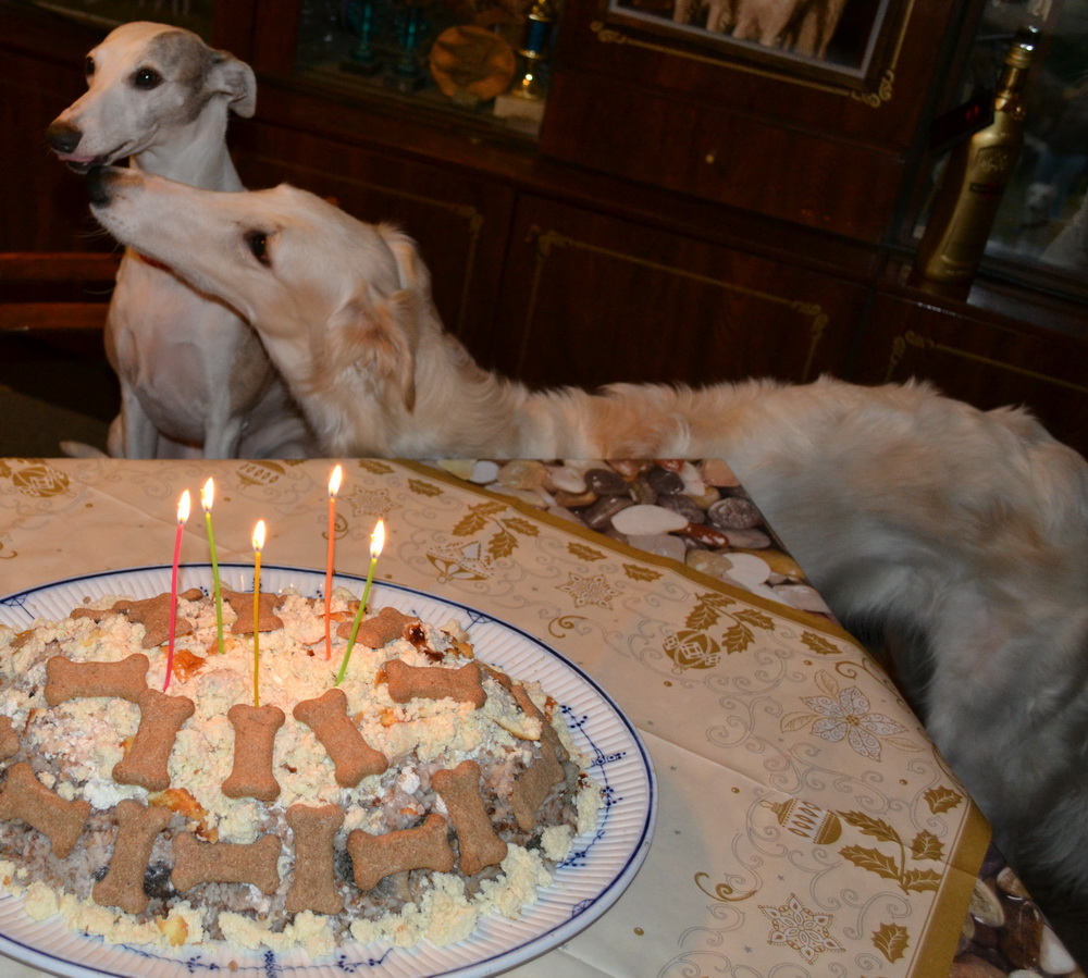 Сегодня двум моим сурикатам, то бишь уиппетам, исполнилось 5 лет. В честь праздника я им на ужин приготовила больш-о-о-о-ой тортик. Так как самое большое блюдо в доме - это от Кузнецова, то пришлось им воспользоваться