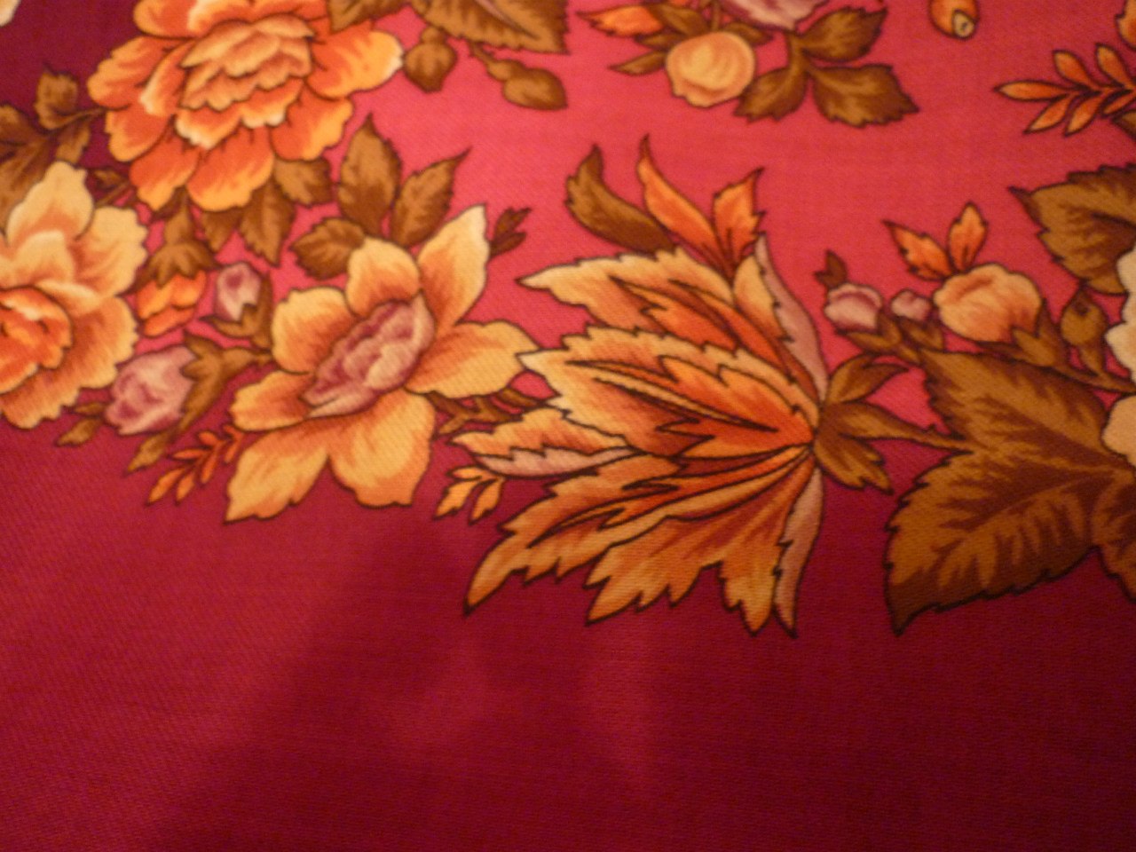 Добралась сегодня до Признания - хороши все. Пыталась пристроить на себя чёрный - к сожалению совсем никак. Зелёного в платочном гардеробе итак много, с синим всегда отношенимя сложные - поэтому из магазина со мной ушёл красный (бордовый). По первому восприятию напоминает красную Цветочную сказку, но богаче колористически (Цветочную сказку люблю нежно). Покажу фрагменты рисунка (цветопередача хромает на все конечности, правильная если только в выходной день - на балкончике). Итак, "Признание-6":