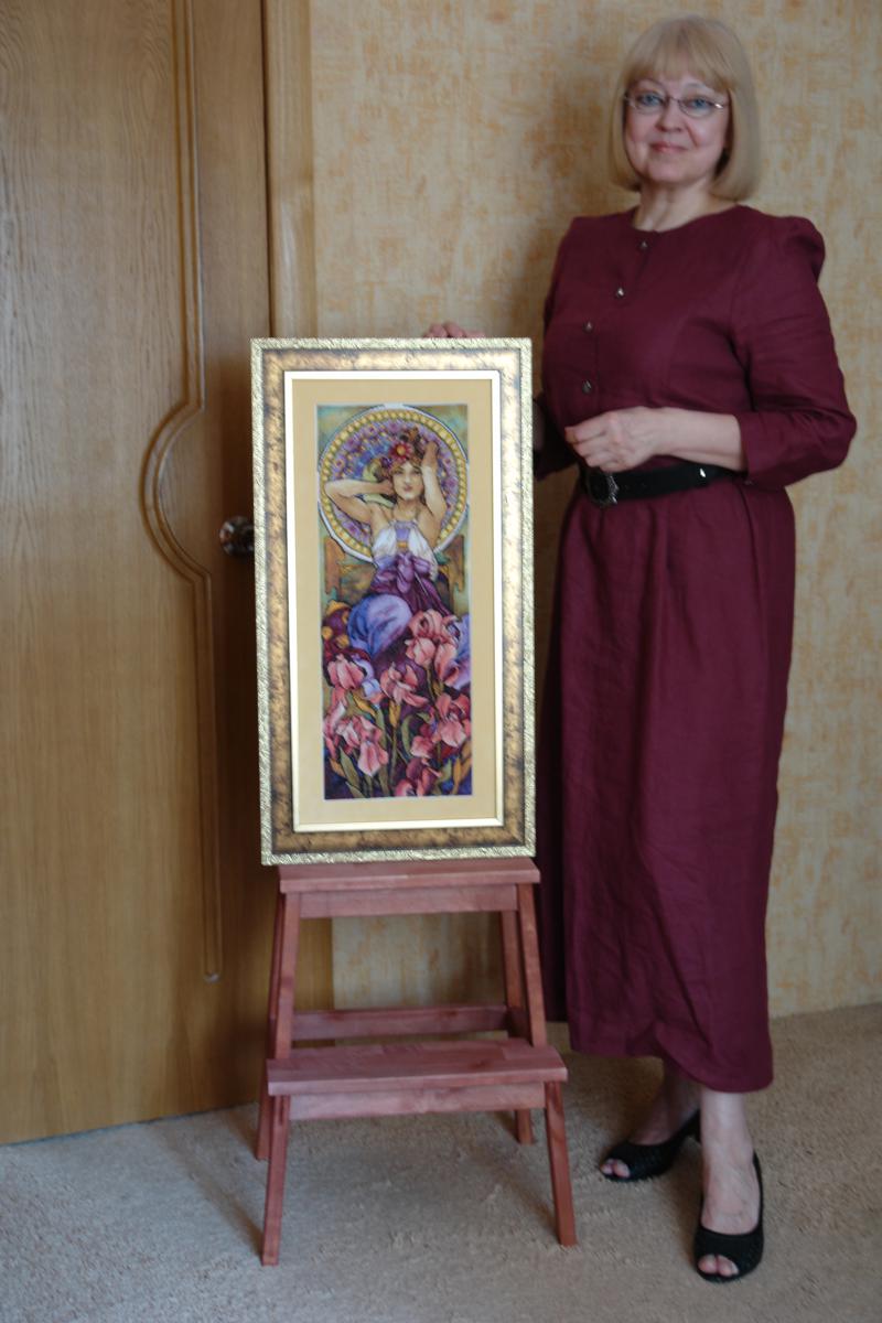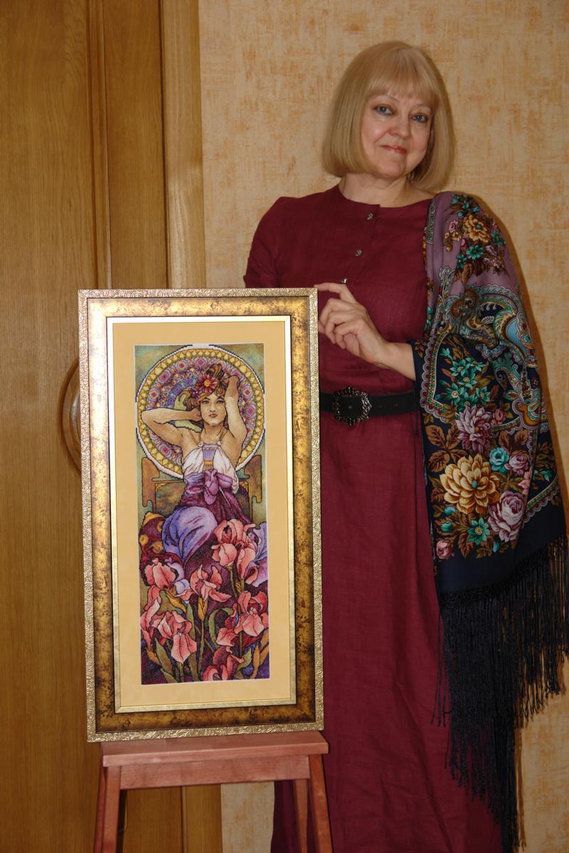 Вышивка по мотивам картины Альфонса Мухи АМЕТИСТ из серии ДРАГОЦЕННОСТИ, льняное платье "Моя прекрасная Людмила" БАРЫШНЯ-КРЕСТЬЯНКА, шаль МАЙЯ -15 по рисунку Екатерины Регуновой
