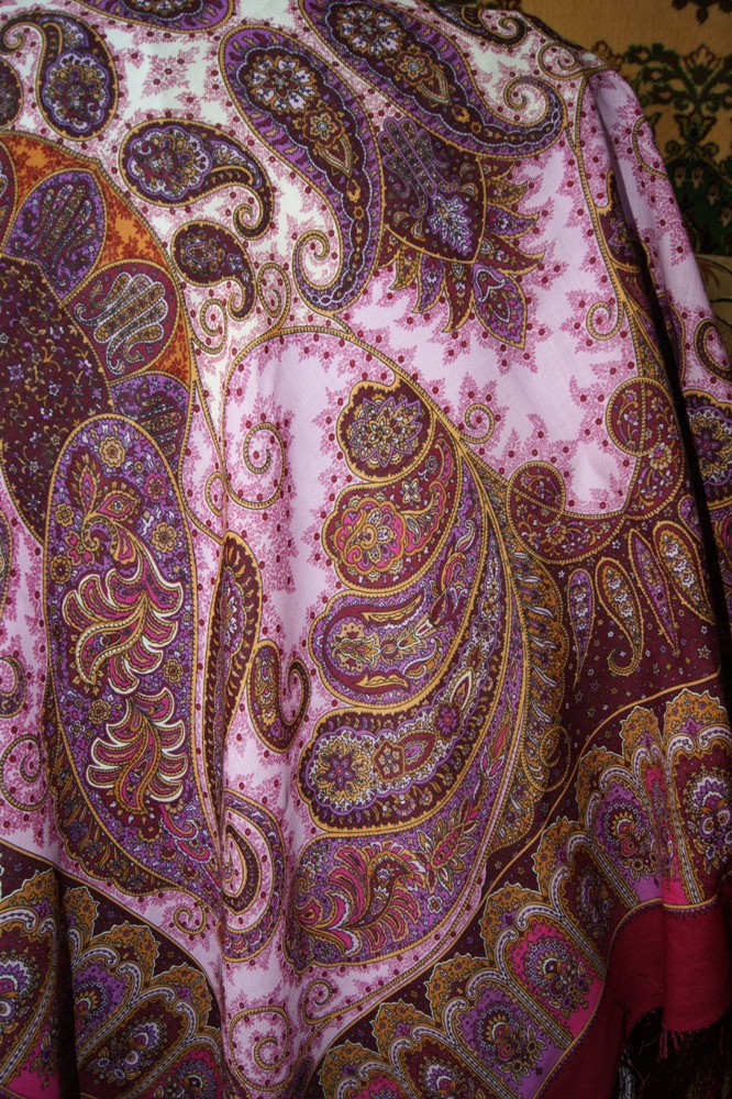 На этой фотографии Ники видно как в рисунок на кайме (от середины фото вправо и немного вверх) вместо цветочка вписано что-то типа клейма овальной формы со словами *ПАВЛОВО*ПОСАД*. Может, и вензель художницы куда-нибудь врисован?