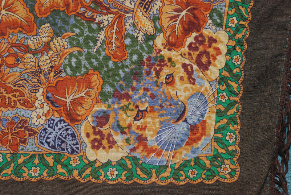 Первый платочек с тиграми - мой любимый. Там очень грубая шерстяная бахрома, а так - он просто мякушка великолепная! Есть там интересное клеймо прямо на рисунке, он на фото увеличен. На каких платках такой ставился знак? Может был юбилей фабрики и на рисунке появилось это клеймо?
