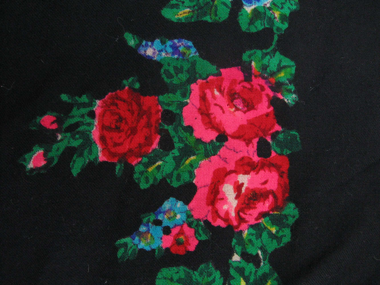 Номер два. Чернопольный платок 89х105, со странной печатью; сомневаюсь, что это ПП, уж очень нетипичным, "рваным" выглядит рисунок, но мало ли. Предыдущий, этот и следующие несколько платков достались от бабушки, им всем минимум 20 лет. Платку не очень повезло, его здорово потрепала моль, но меня чем-то привлекает небрежность узора, поэтому занимаюсь его восстановлением (попросту штопаю). Штопаные места маскирую вышивкой а-ля гладь (учитывая повреждения, хуже ему уже не стать, а так будет носибельным).
