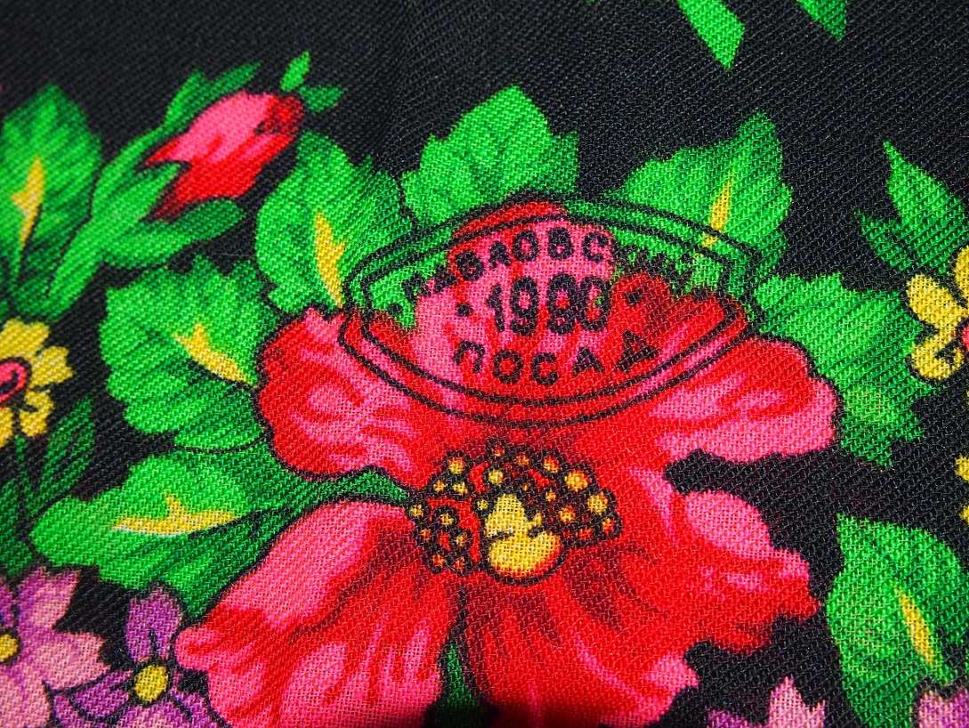 Ткань на платках тогда была очень плотной, почти как на уплотненке сейчас. Но после многолетней носки и стирки ткань стала немного тоньше, рисунок чуть-чуть побледнел, но все равно плат очень-очень красный и красивый.