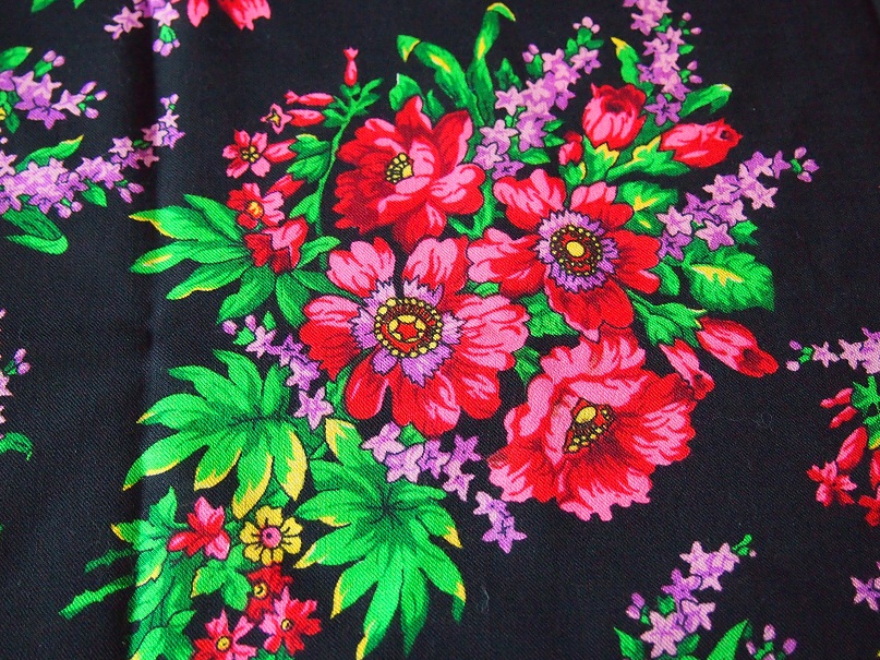 Ткань на платках тогда была очень плотной, почти как на уплотненке сейчас. Но после многолетней носки и стирки ткань стала немного тоньше, рисунок чуть-чуть побледнел, но все равно плат очень-очень красный и красивый.