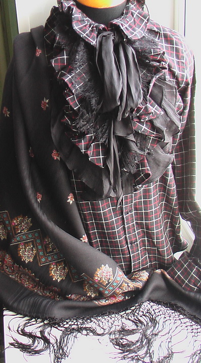 Исходя из личного опыта, могу сказать, что для красивой комплектации двух тканей, содержащих различные принты, просто необходимо наличие монохромной (барьерной) детали одежды. В Вашем случае с этой ролью прекрасно справляются черные оборки жабо и средняя часть шали с мелкими незначительными цветочками.