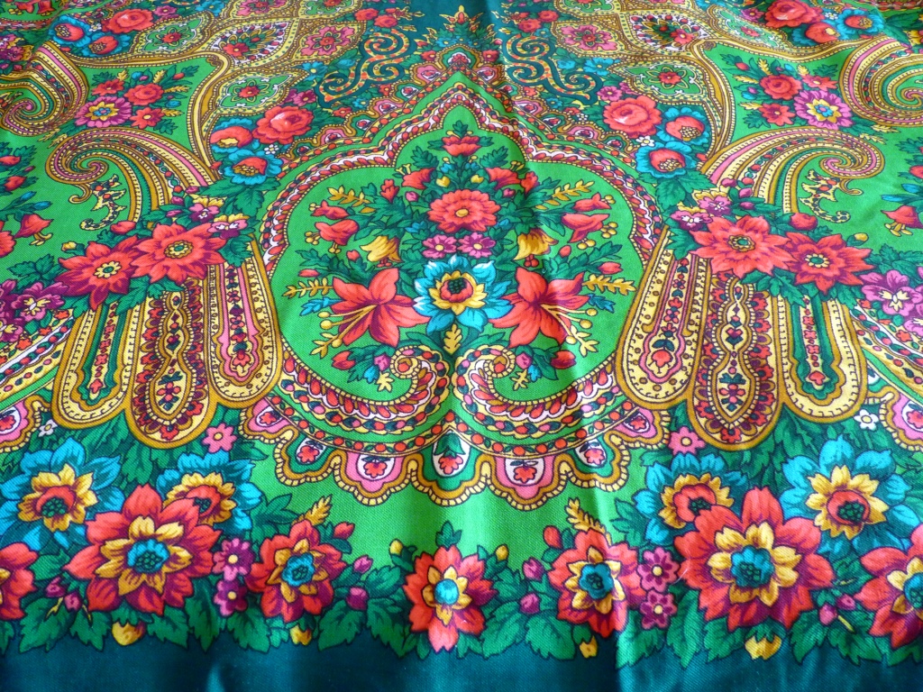 Нашла у мамы ПП шаль, вспомнила, что когда-то она ее часто носила под шубу. Рисунок показался очень знакомым, но колорит необычным. Принесла домой, сравнила, оказался зеленый Разводной, но такого варианта в базе не нашла. Кисти у шали вязаные, шерстяные. Печати ППМ не обнаружила и у мамы забыла спросить, когда она ее покупала.